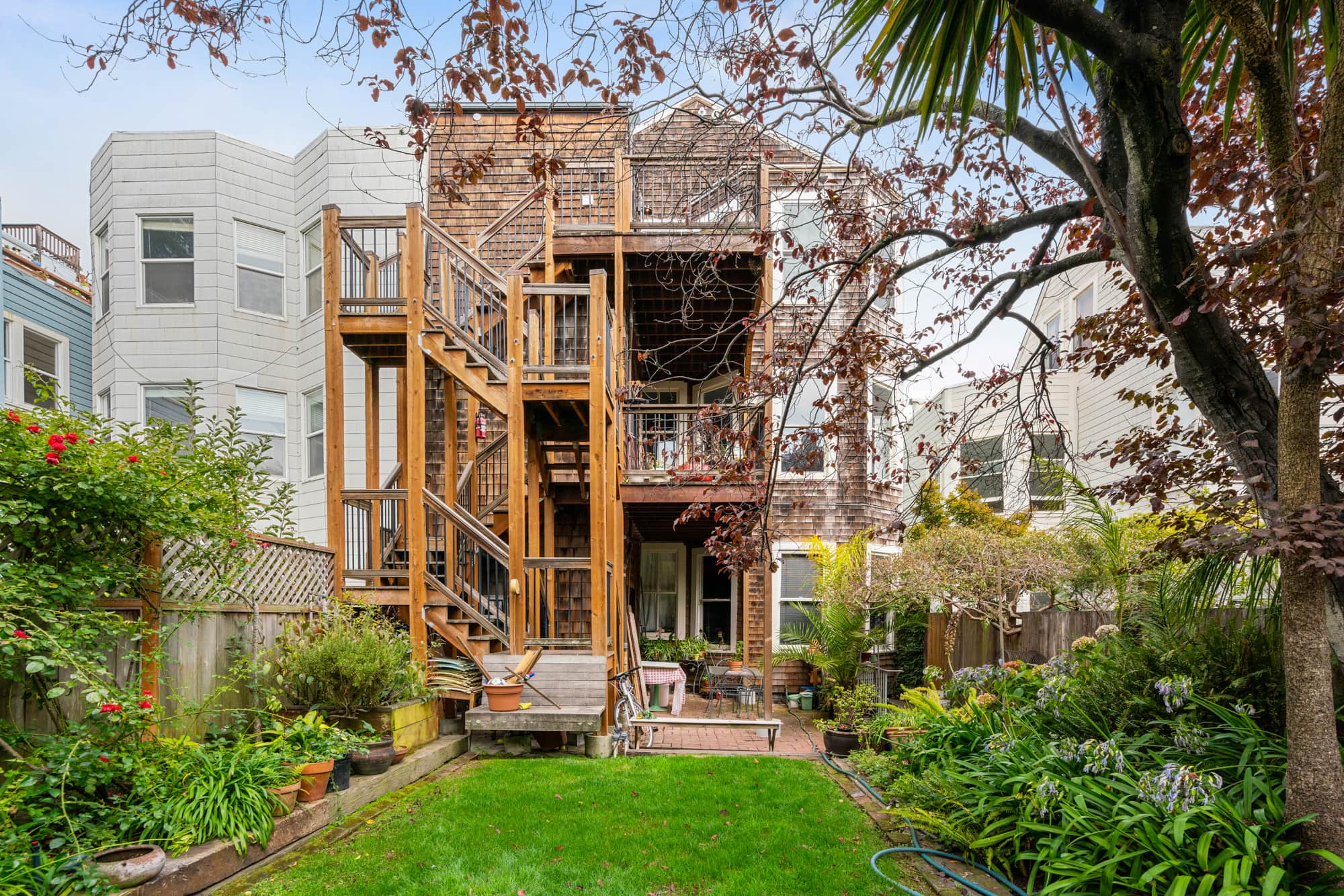 Part of a charming and friendly three-unit building that’s detached on three sides on an extra deep parcel, 1329 features an historically significant front facade along this tree-lined part of McAllister. There’s a shared backyard with lush plantings, a plum tree and hummingbirds that you can access via your deeded sunny, south-facing outdoor patio. Views are abundant, with a direct view of Alamo Square from the south-facing kitchen and dining room windows, a view of City Hall to the east from the patio, various Victorians across the street, and the Trans-America building and downtown from the living room window. 1329’s walk score is a 94 while its transit and bike scores are 88 and 83 respectively and parking is just down stairs to the right.