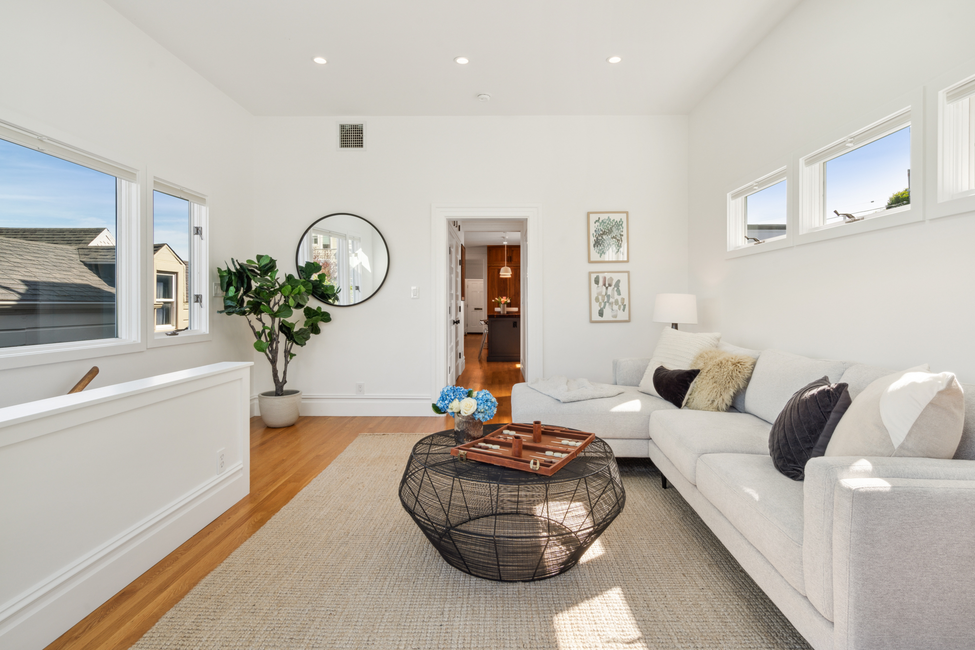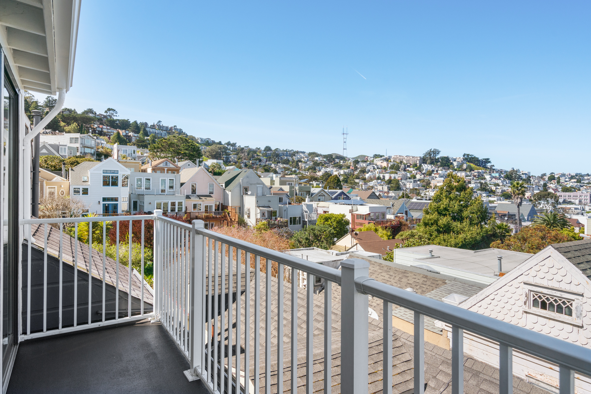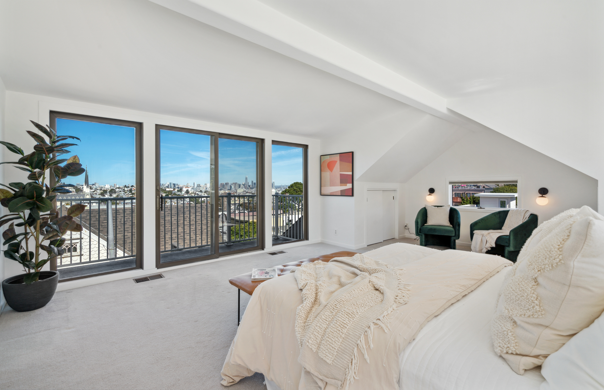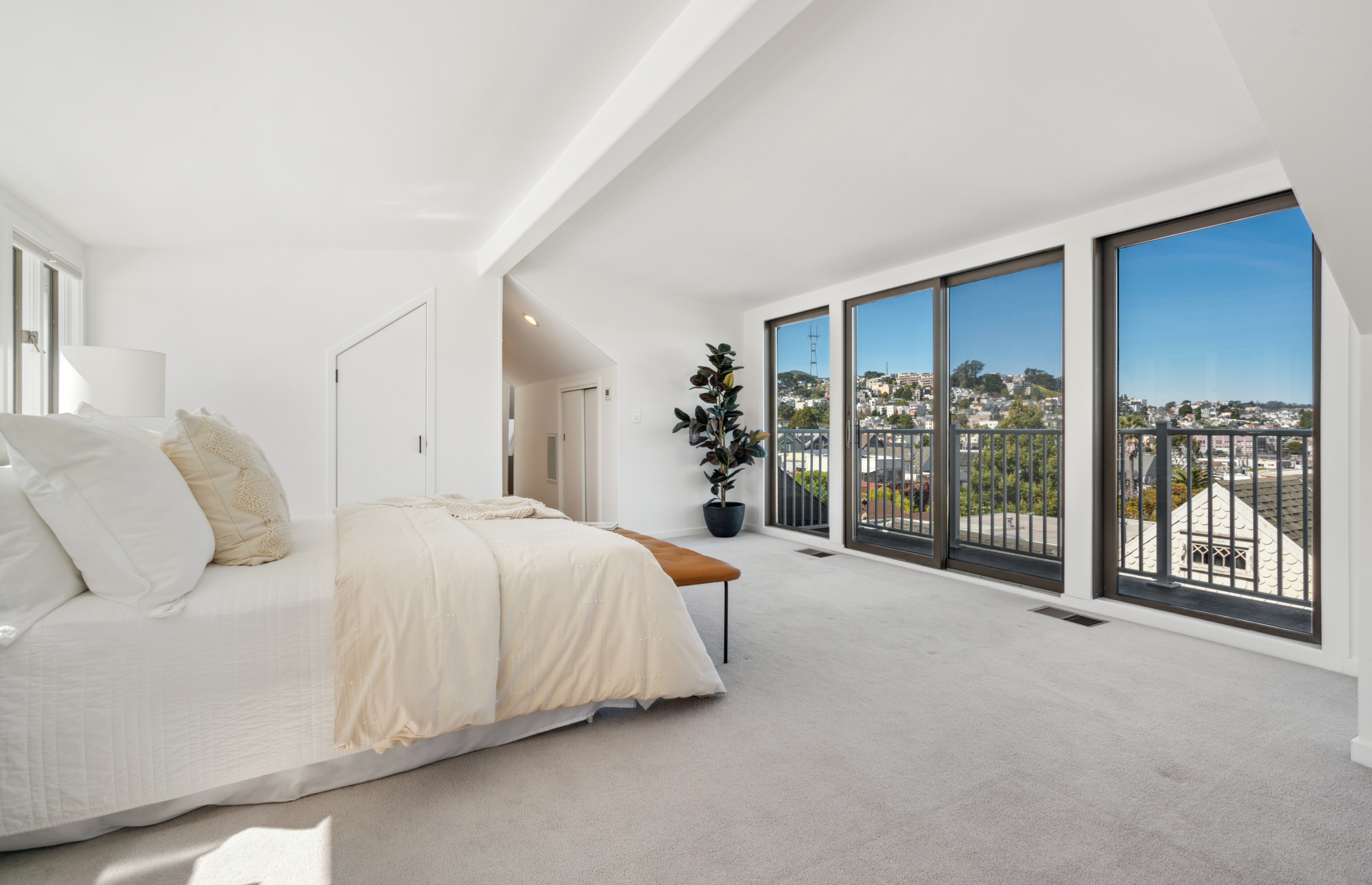 - Upper Residence ( #1884): A Testament of Design and Comfort The premier part of the home is the the top two levels of the home, which has nearly 2,000 sqft of appointed space, including 3 bedrooms and 2 bathrooms. The interior seamlessly marries coved ceilings and hardwood floors with modern amenities like air conditioning (via heat pump), creating a living space that is both elegant and comfortable. At the heart of this unit is a bespoke kitchen, equipped with high-end appliances, luxurious walnut cabinetry, and a butcher-block island, making it a perfect gathering spot for friends and family. The family room, with its cathedral ceilings and 220-degree views, leads to a balcony offering breathtaking views of the San Francisco skyline and bay.