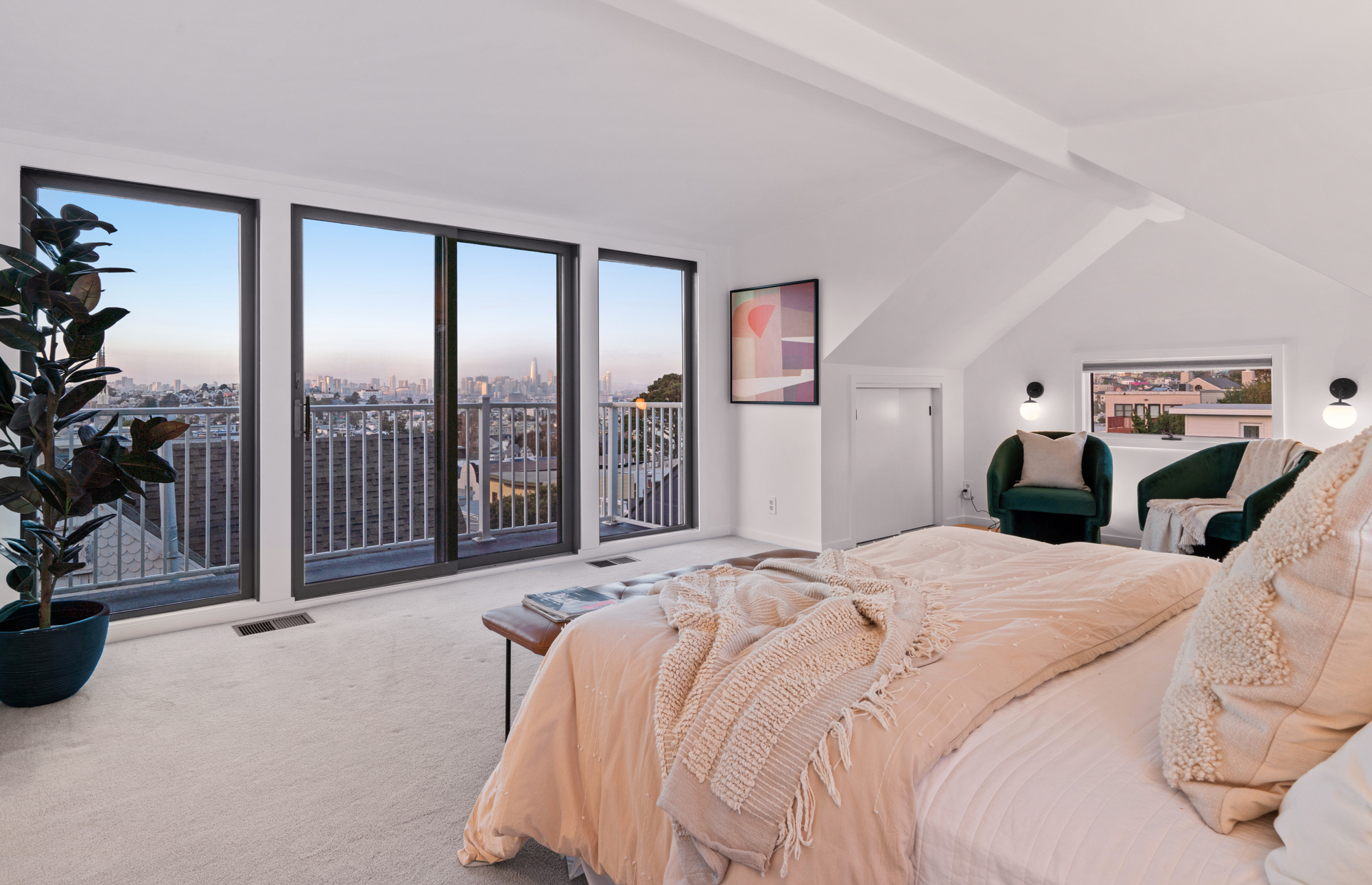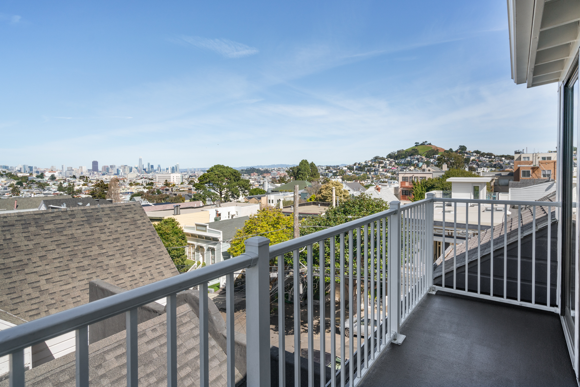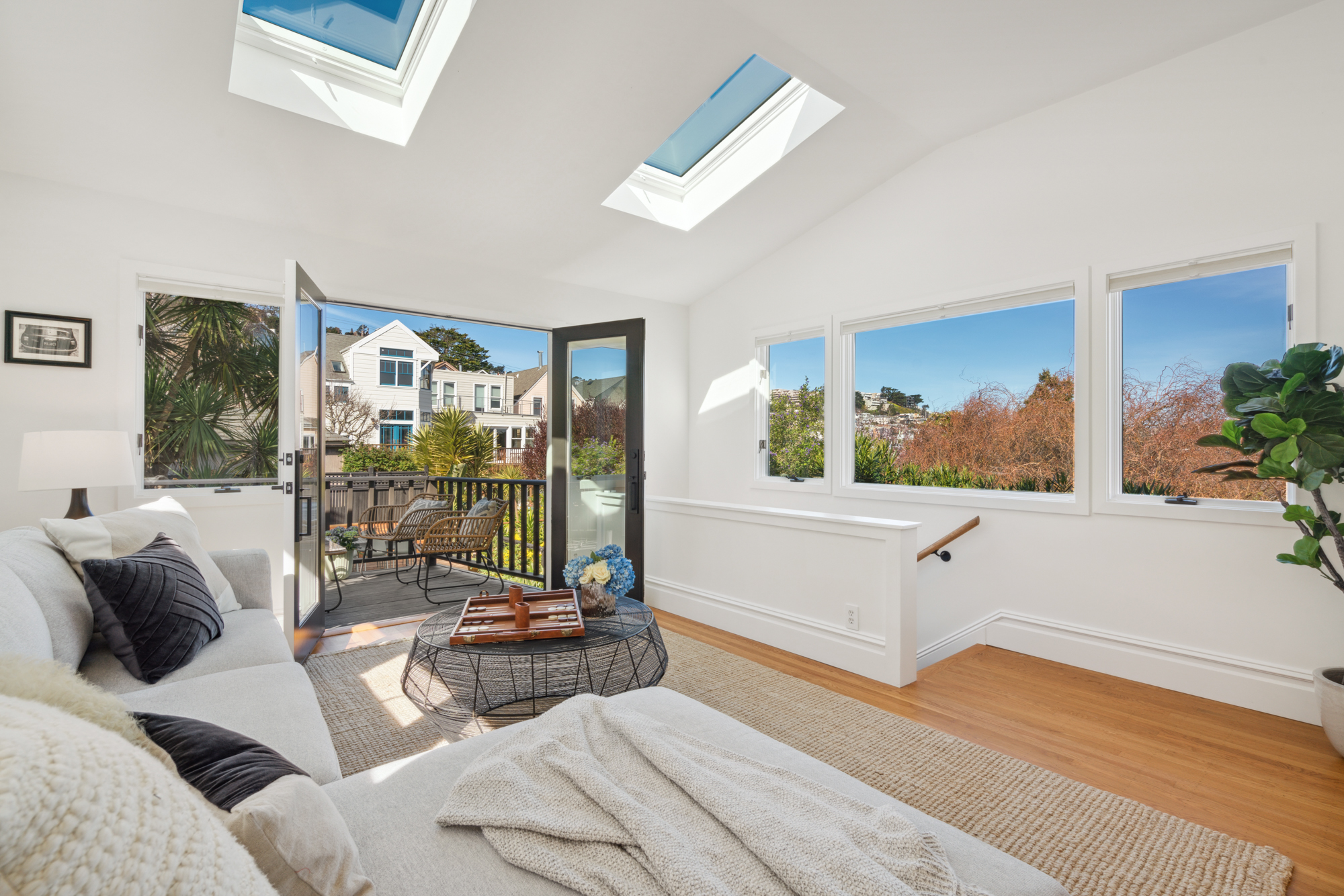 - Upper Residence ( #1884): A Testament of Design and Comfort The premier part of the home is the the top two levels of the home, which has nearly 2,000 sqft of appointed space, including 3 bedrooms and 2 bathrooms. The interior seamlessly marries coved ceilings and hardwood floors with modern amenities like air conditioning (via heat pump), creating a living space that is both elegant and comfortable. At the heart of this unit is a bespoke kitchen, equipped with high-end appliances, luxurious walnut cabinetry, and a butcher-block island, making it a perfect gathering spot for friends and family. The family room, with its cathedral ceilings and 220-degree views, leads to a balcony offering breathtaking views of the San Francisco skyline and bay.