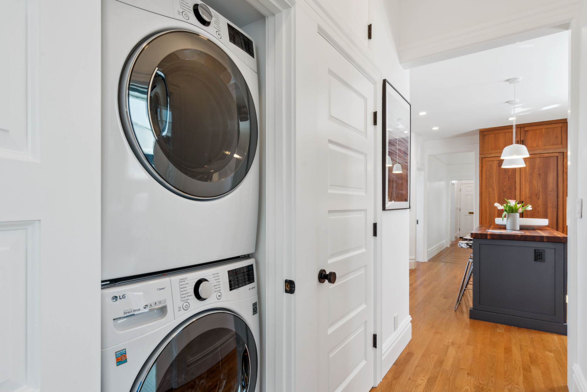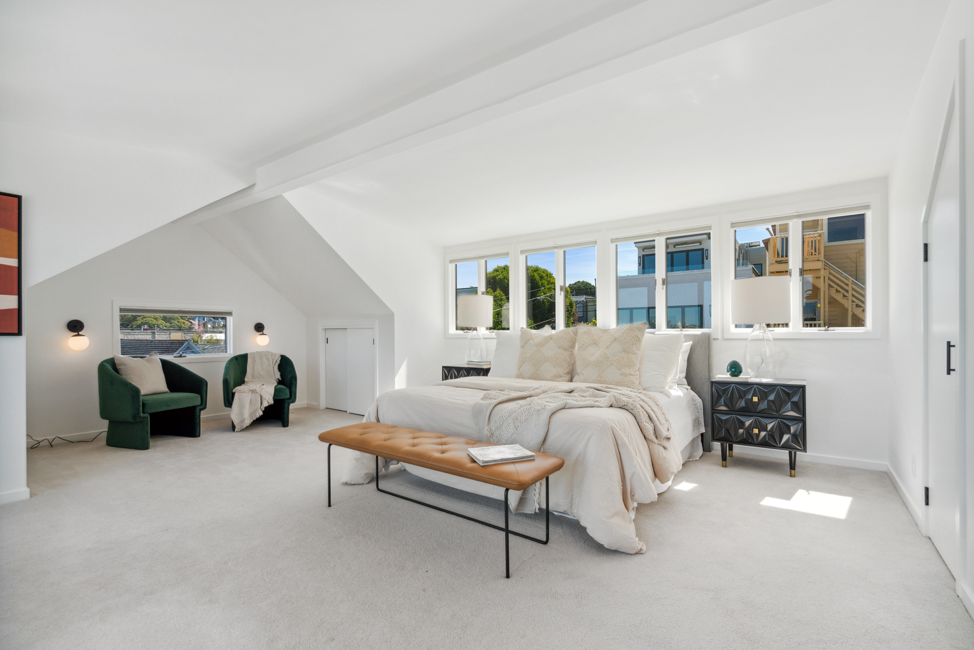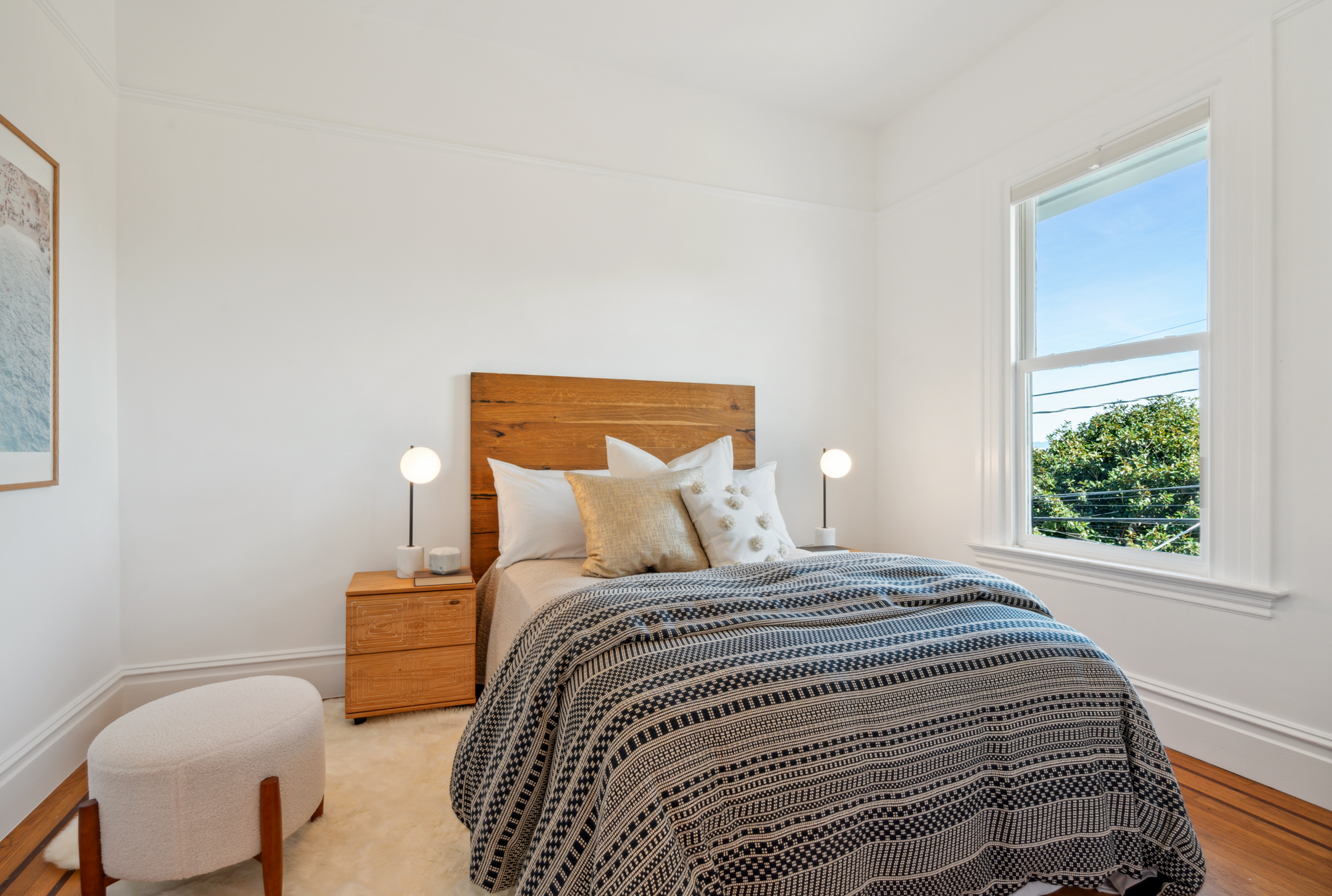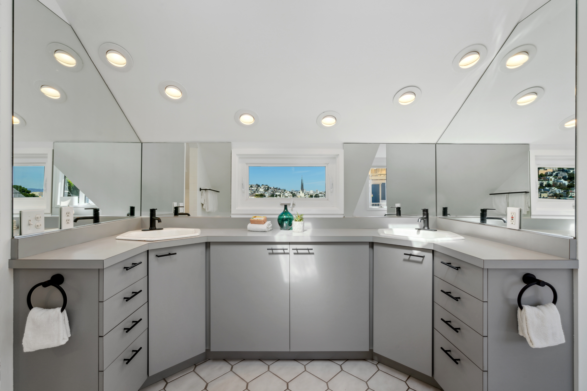 - Upper Residence ( #1884): A Testament of Design and Comfort The premier part of the home is the the top two levels of the home, which has nearly 2,000 sqft of appointed space, including 3 bedrooms and 2 bathrooms. The interior seamlessly marries coved ceilings and hardwood floors with modern amenities like air conditioning (via heat pump), creating a living space that is both elegant and comfortable. At the heart of this unit is a bespoke kitchen, equipped with high-end appliances, luxurious walnut cabinetry, and a butcher-block island, making it a perfect gathering spot for friends and family. The family room, with its cathedral ceilings and 220-degree views, leads to a balcony offering breathtaking views of the San Francisco skyline and bay.