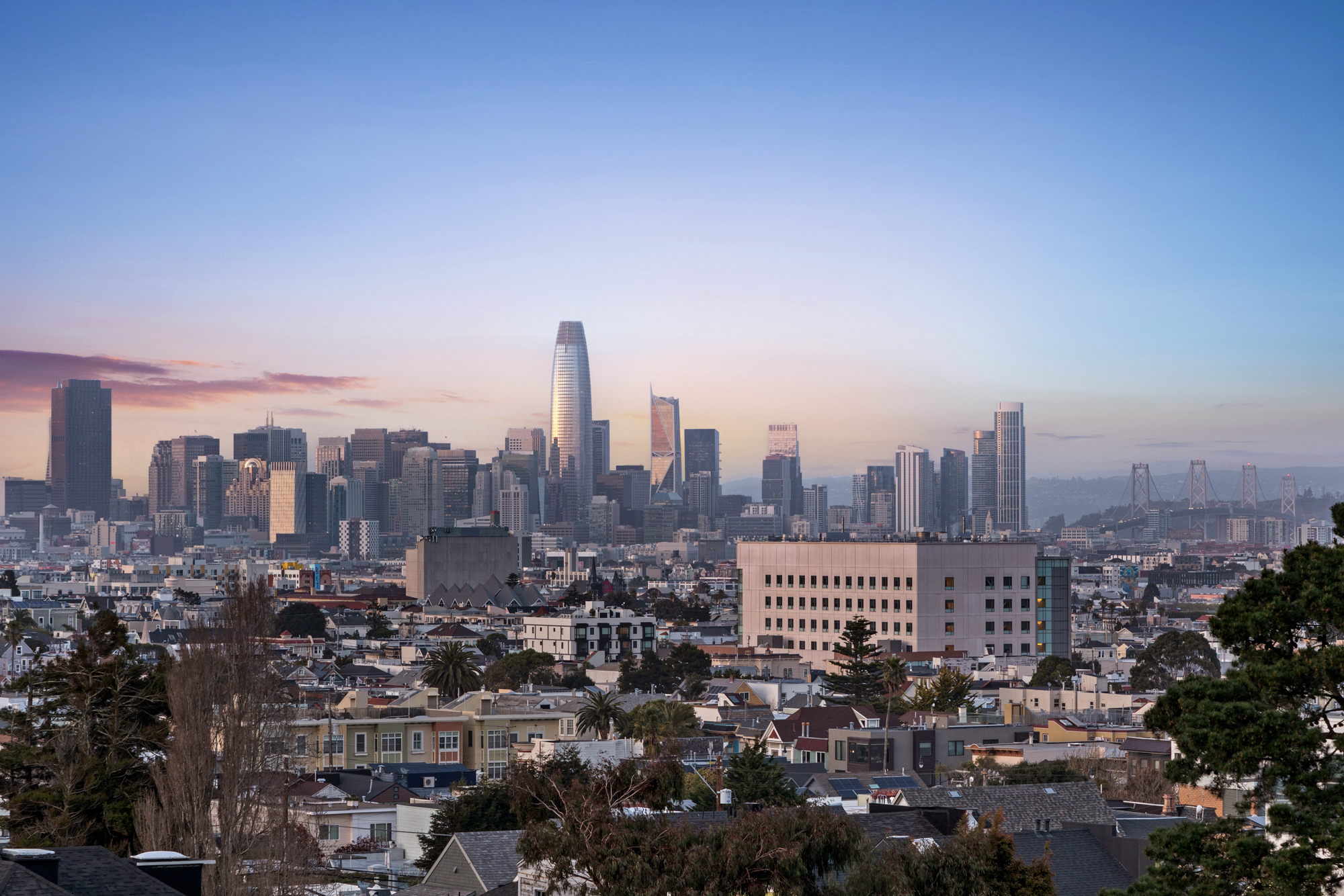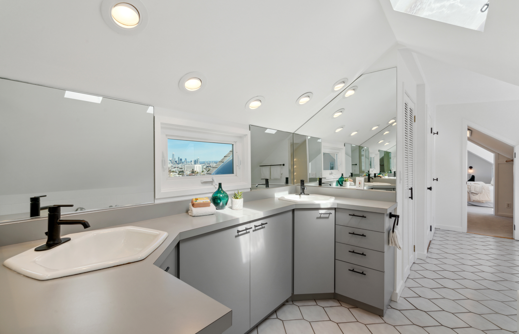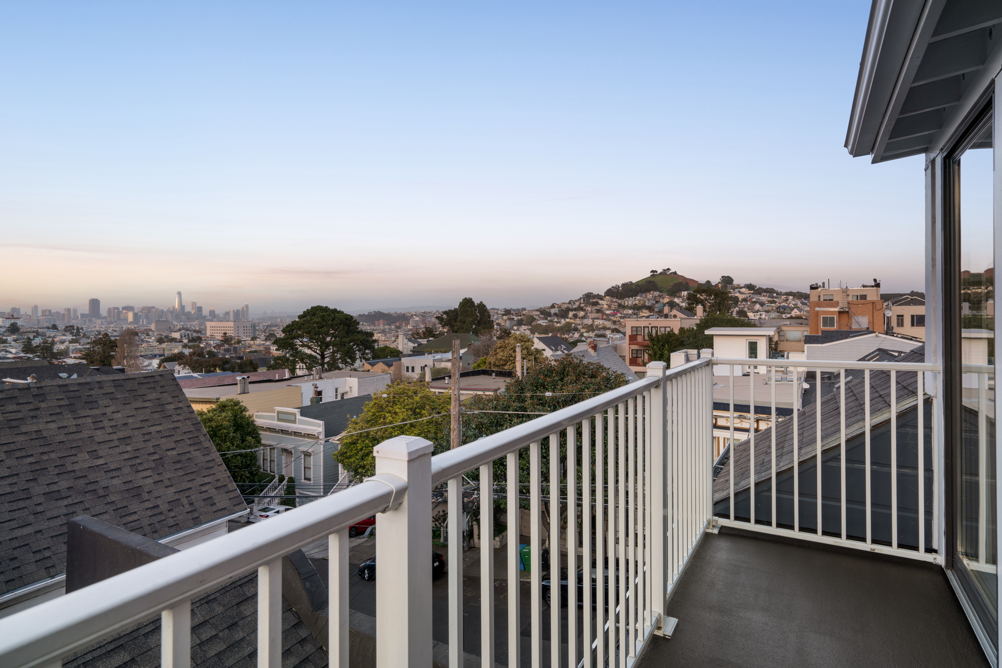 The warm ambiance is elevated by Schoolhouse Electric light fixtures, and the cathedral-ceilinged family room, complete with a balcony, offers 220° views. The top level features a primary bedroom suite with a patio boasting expansive skyline and bay views. The ground level has 2 bedrooms, a full bath, its own kitchen, entrance + laundry — perfect for flexible living arrangements. The entire residence, delivered vacant, opens out to a west-facing backyard oasis that becomes magical at sunset. A 1-car garage with second refrigerator adds to the convenience.