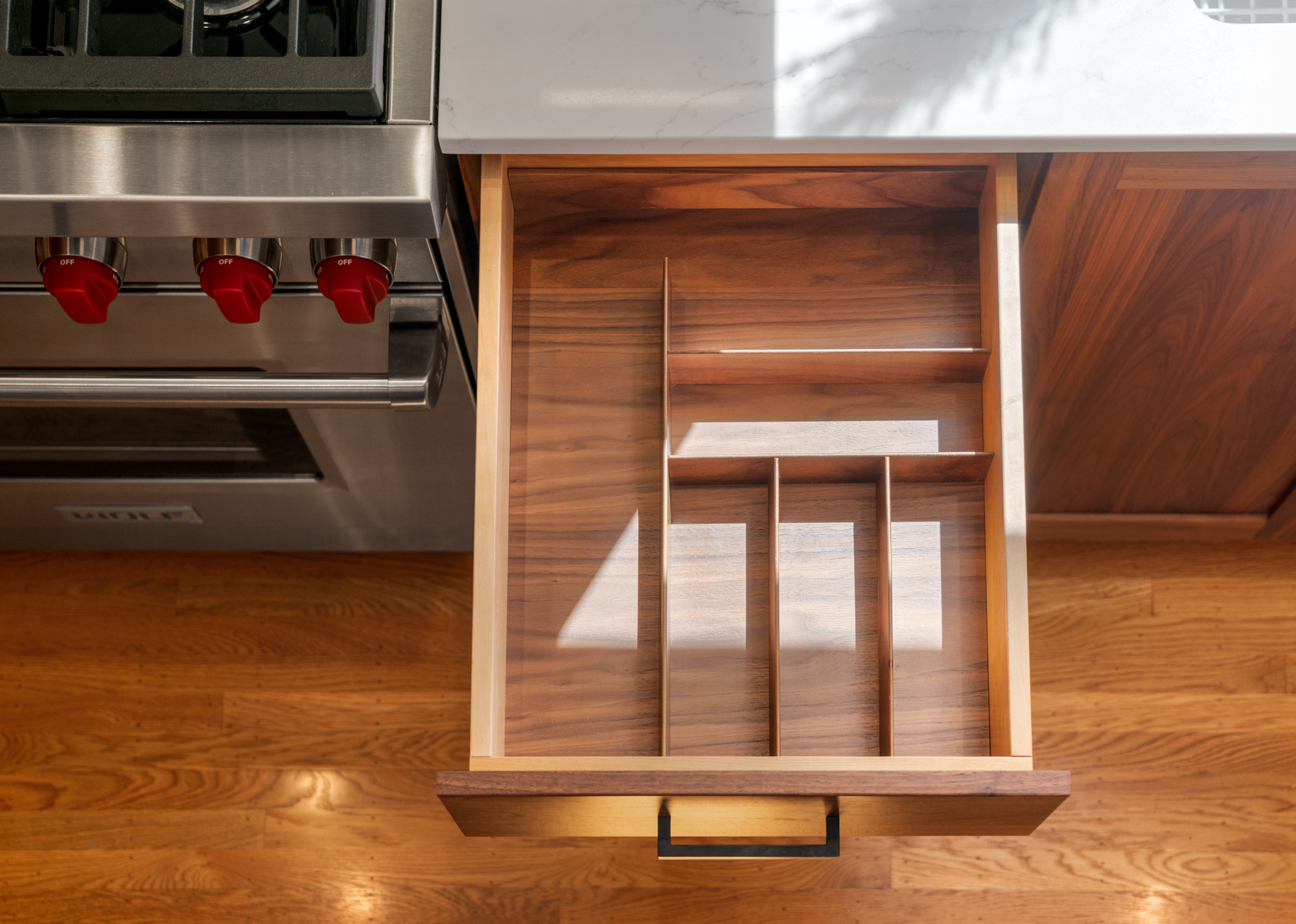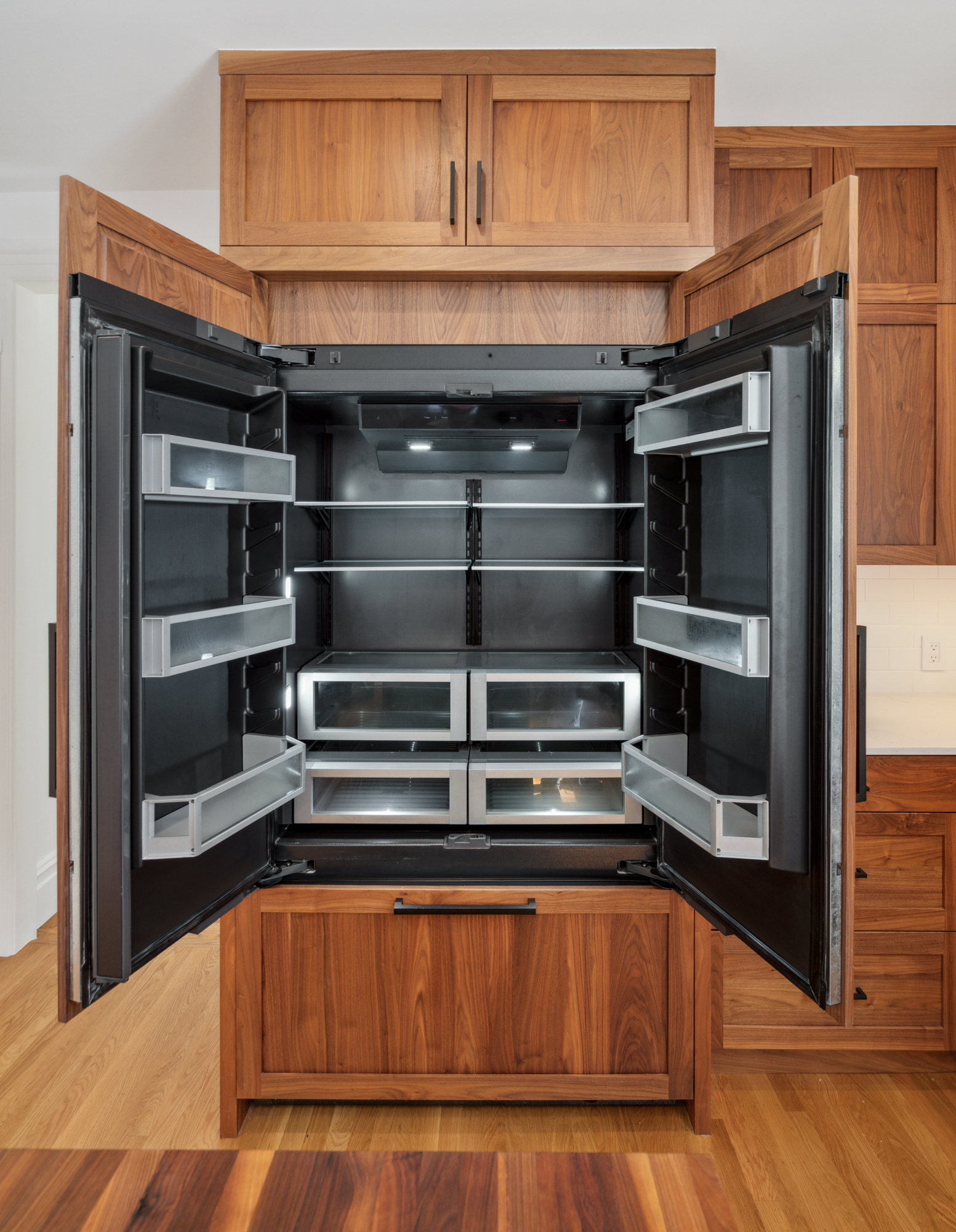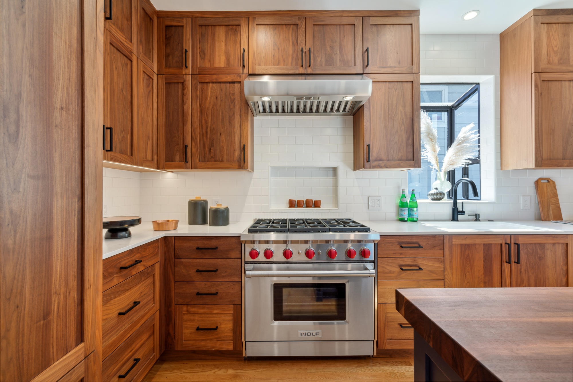 - Stunning upper kitchen with walnut cabinety, subway tile, quartz counter tops and luxe features including a 36", 6-burner gas range by Wolf, built-In Jenn-Air Refrigerator, nudge-to-open waste bins, dishwasher, externally vented hood and pantry