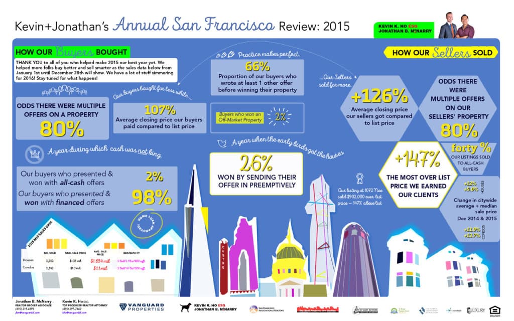 2015 is done and in 2015 real estate clients of realtors Kevin Ho and Jonathan McNarry of Vanguard Properties outperformed their peers in San Francisco’s ‘crazy’ real estate market. Take a look below to see how and if you want to know the ‘why’ contact the pair today.