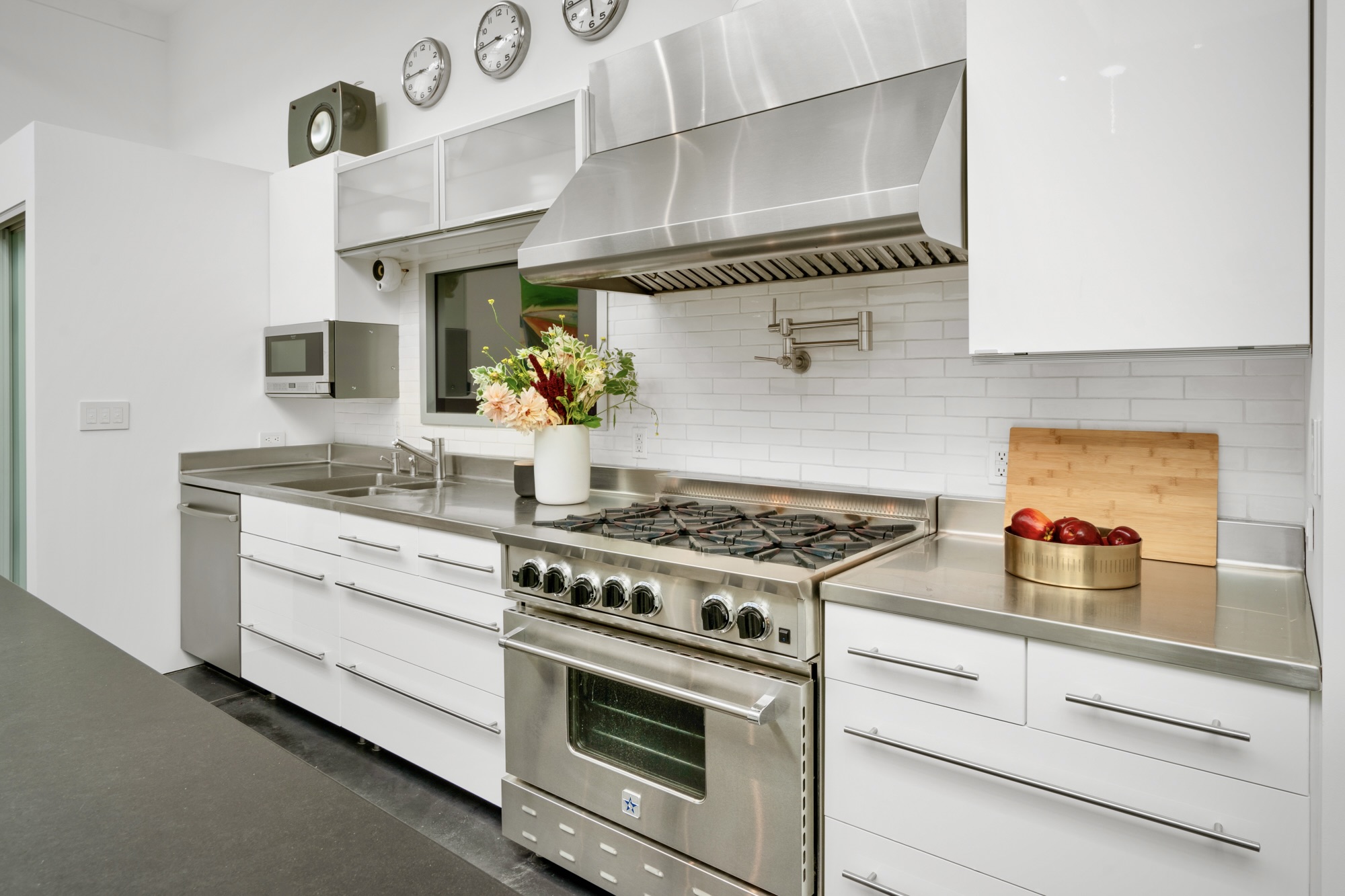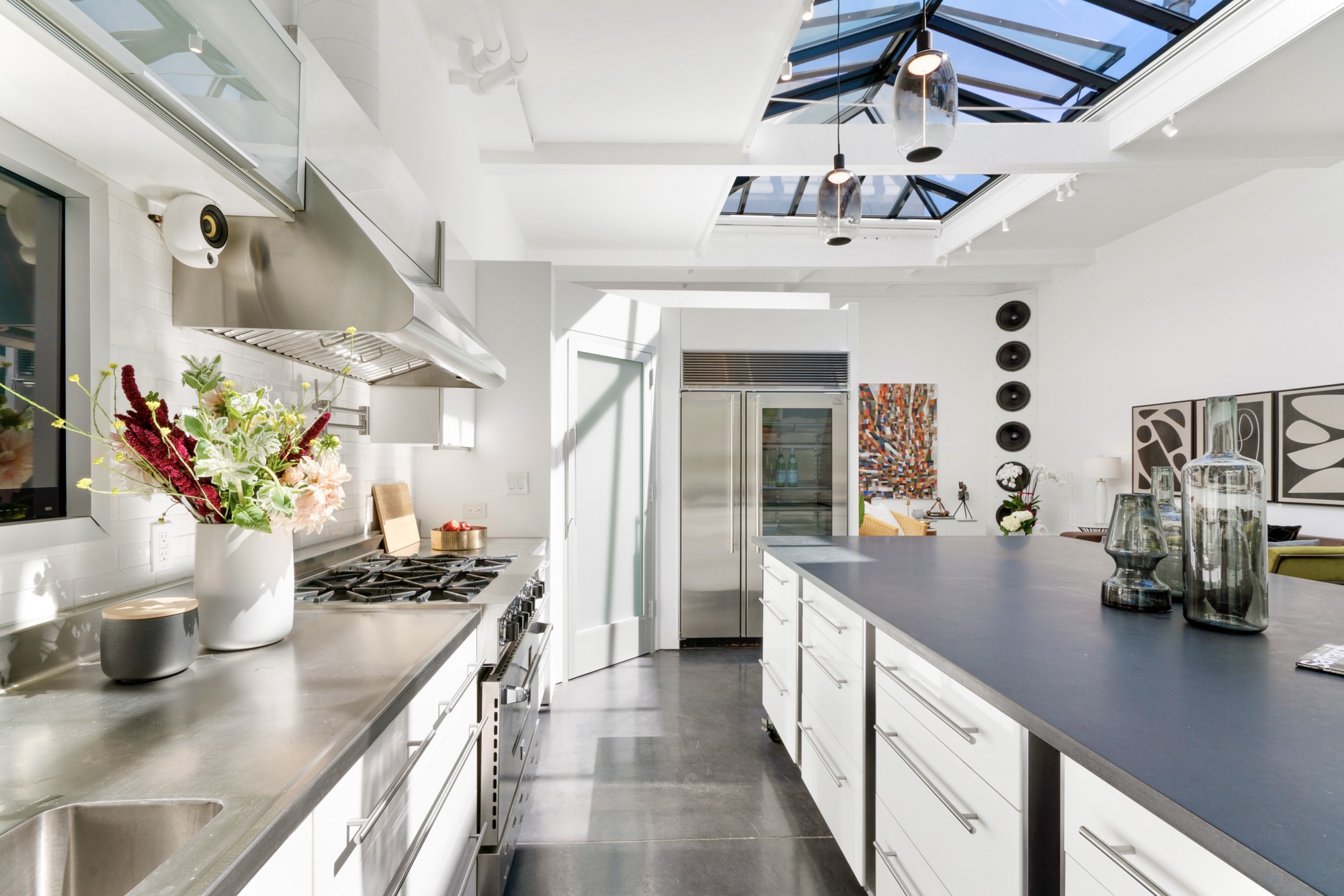 Step inside through the bold red door to a sprawling open-plan living area featuring reclaimed wood timbers, exposed brick, and just-updated, openable industrial windows that overlook a tranquil, tree-lined street. The gourmet kitchen, equipped with high-end stainless steel appliances and a massive island, is designed for both casual meals and sophisticated entertaining. Upstairs, a sunny private roof deck with skyline views invites you to relax and enjoy alfresco dining, morning coffee, or evening cocktails in a serene setting.