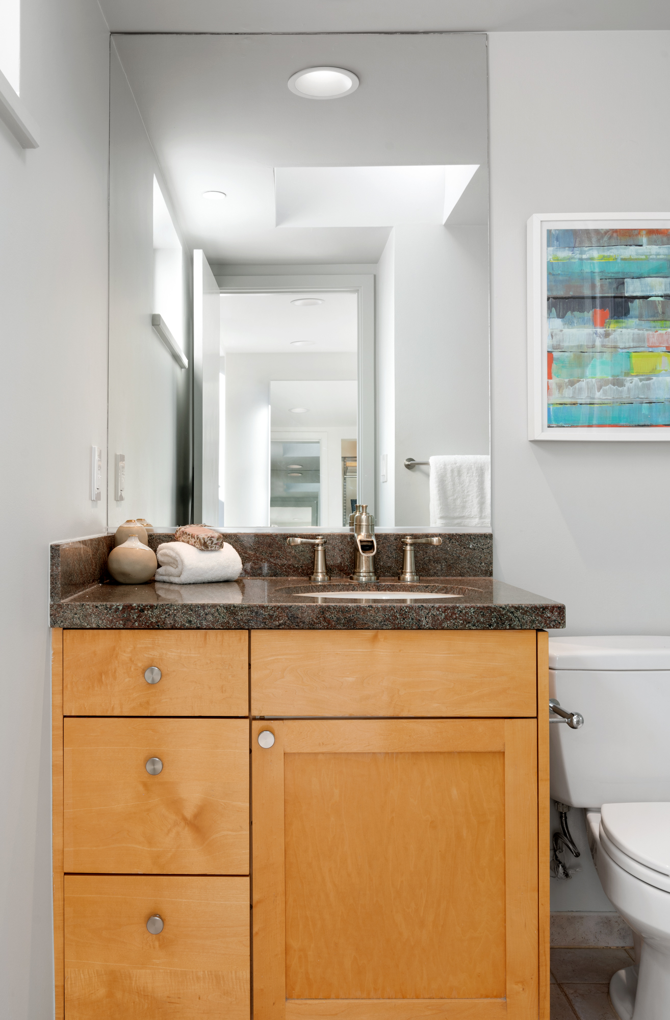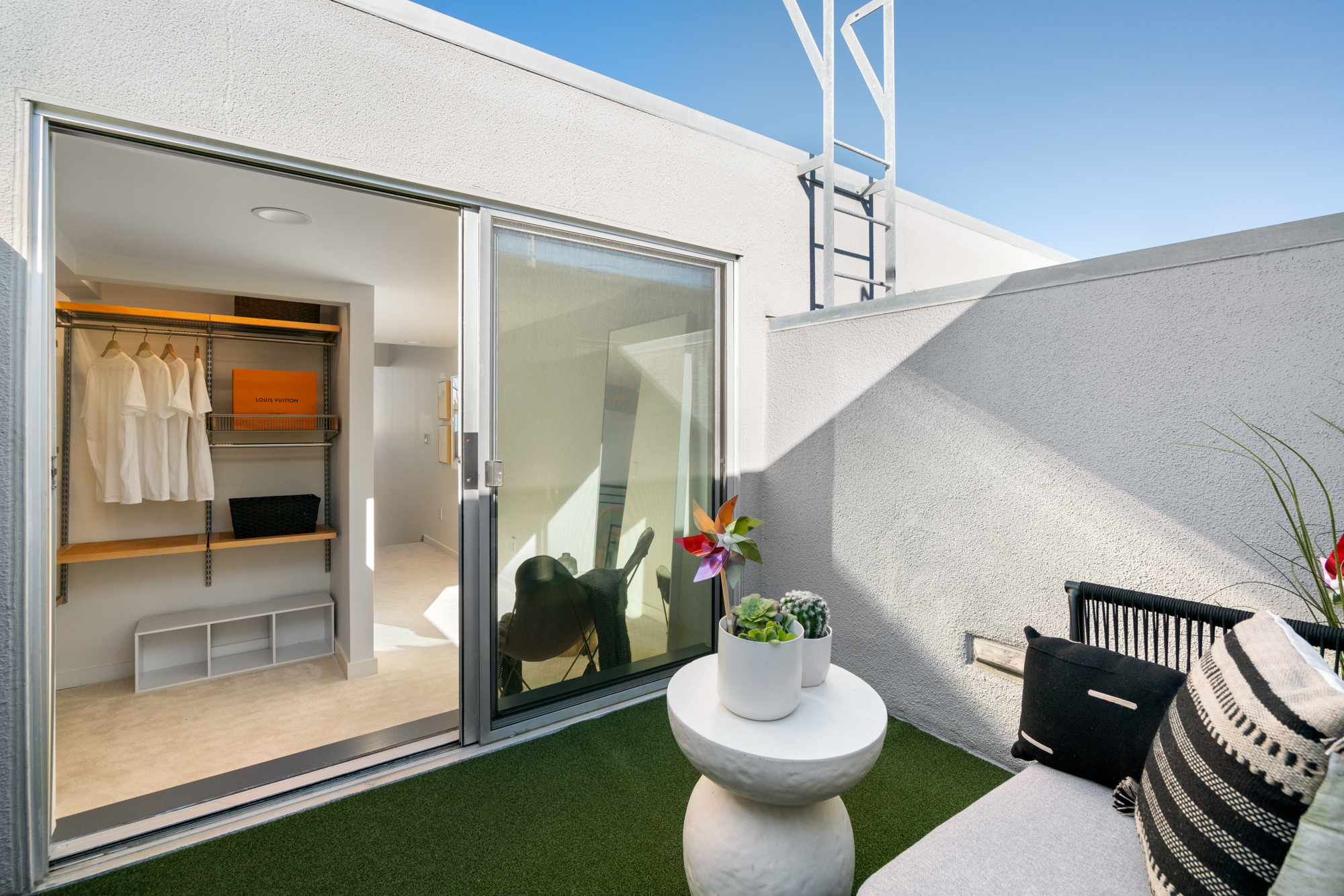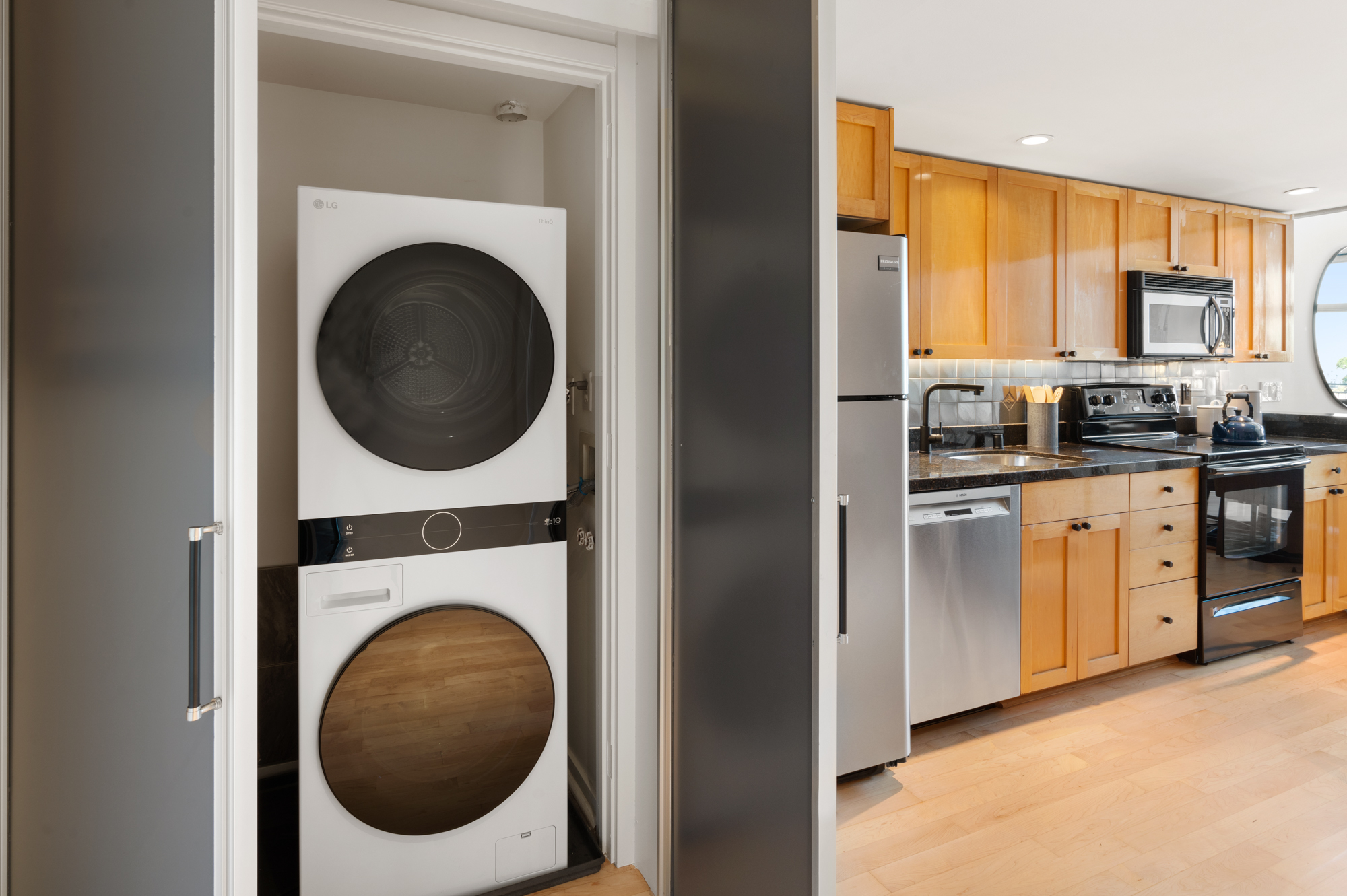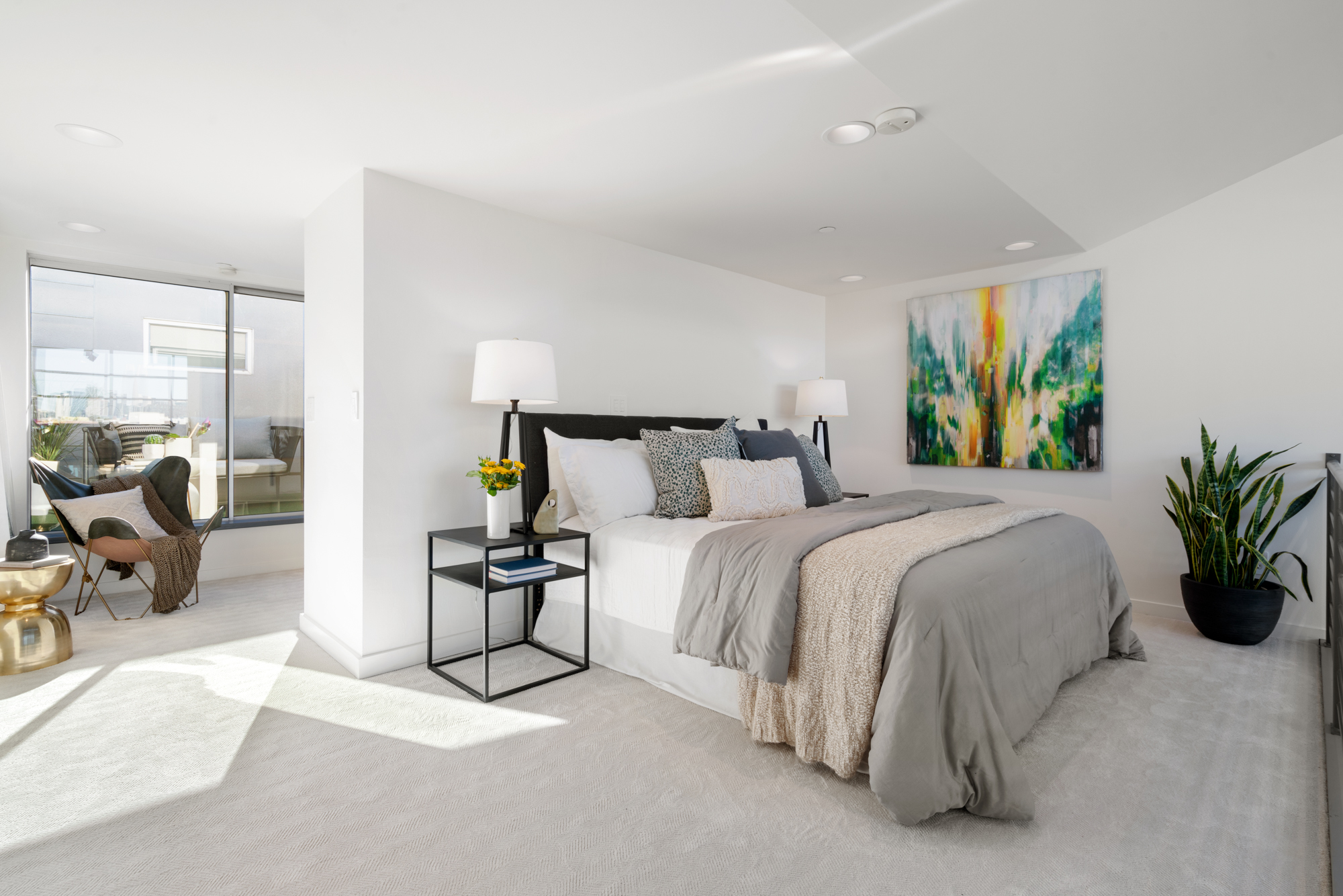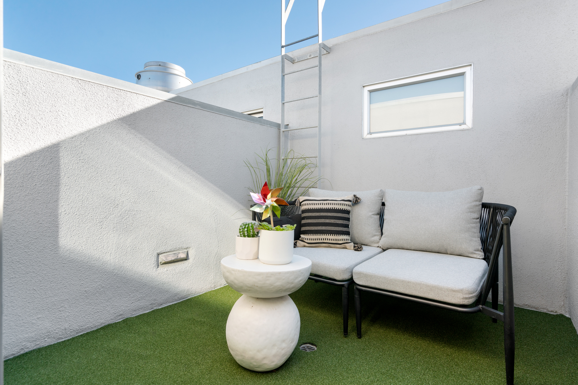 Upstairs, the loft level offers a spacious bedroom retreat with plush carpeting, LED-lit closets, a skylit ensuite bathroom, and access to a private courtyard—a serene outdoor space perfect for relaxation. Thoughtful updates throughout the home include luxe maple floors, modern LED lighting with Lutron dimmers, a smart ceiling fan, and a new LG washer/dryer.