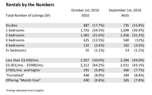 With the stated objective of adding more housing units in San Francisco, public policy planners have streamlined the approval process to the extent they can. The result? More rental units have debutted in San Francisco over the past year. As such you can see some price easing (less than 5% on average from 2015). The chart to the right shows that progress has proven incremental but it’s still progress. But remember all of the units added are usually exempt from San Francisco’s Rent Ordinance meaning they’re exempt from rent control and eviction control regulations and protections.